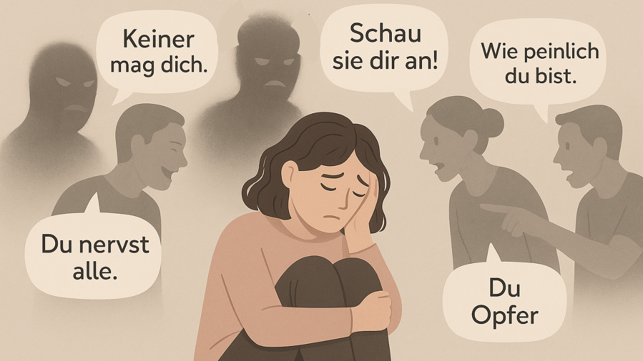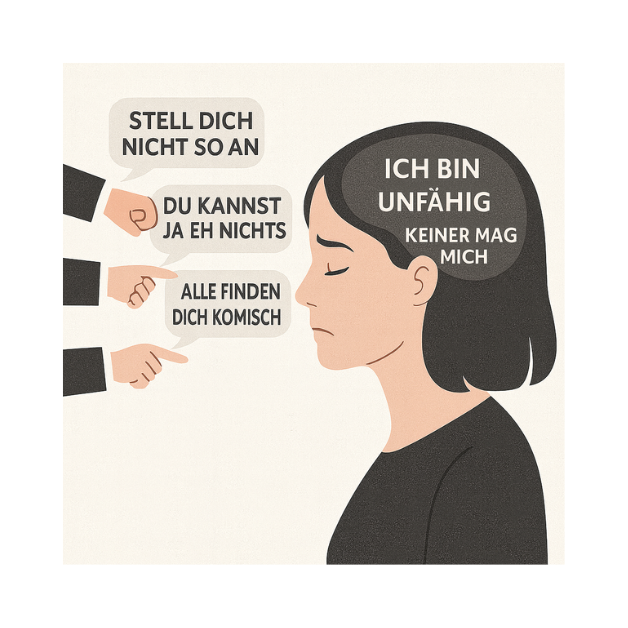 - Man wird ständig kritisiert, abgewertet oder belächelt: „Stell dich nicht so an“, „Du kannst ja eh nichts“, „Alle finden dich komisch“.