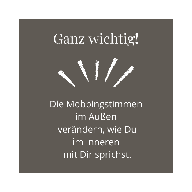 - Täterintrojekte identifizieren: Wo rede ich innerlich wie die Mobber? → diese Stimmen entmachten, bewusst ersetzen durch positive und stärkende Glaubenssätze „Ich bin mehr als diese Erfahrung.“